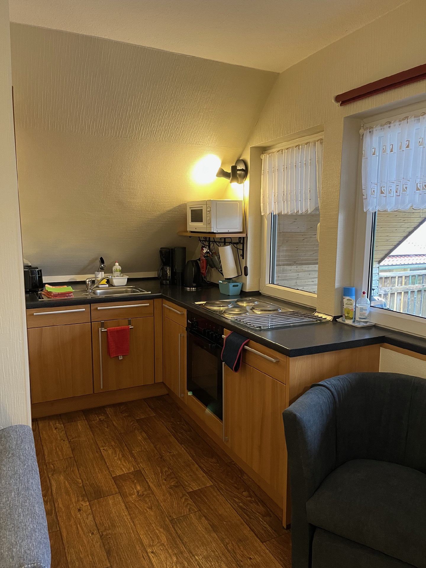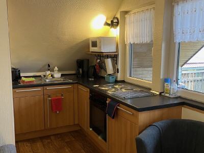 In der Küche befinden sich Geschirrspüler, Mikrowelle, Kühlschrank, Gefrierschrank, Backofen, Wasserkocher, Handmixer, Eierkocher, Toaster und alle notwendigen Küchenhelfer und Küchenbedarf.